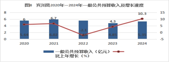 2024年,全县一般公共预算收入达5.35亿元,增长10.3%;一般公共预算支出完成28.31亿元,增长14.2%。其中:教育支出51555万元,增长0.2%;社会保障和就业支出48180万元,增长8.2%;卫生健康支出41285万元,下降1.8%;城乡社区支出4783万元,下降34.5%;农林水支出72312万元,增长58.8%;交通运输支出4809万元,增长22.3%;住房保障支出12350万元,下降10.2%。