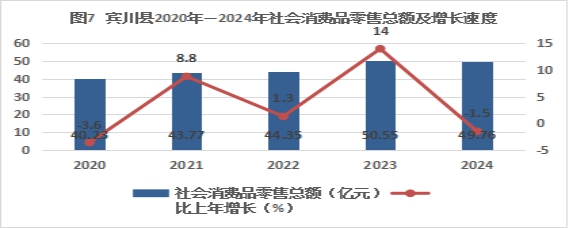 2024年,全县社会消费品零售总额49.76亿元,下降1.5%。