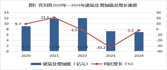 2024年,全县建筑业增加值7亿元,按可比价下降2.1%。全县具有资质以上建筑企业17户,全年完成产值12.68亿元,增长12.4 %。
