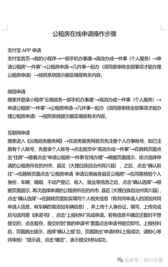 搜索进入《云南政务服务网》→在政务服务网首页先注册个人办事账号,如已注册有个人账号,先登录个人账号→点击首页中"高效办成一件事"→在跳转页面点击"住房"→接着点击"申请公租房"一件事在线办理"→根据页面提示,依次选择申请的公租房所在的州市、县区(大理白族自治州宾川县),之后,点击"确认前往"→在跳转页面点击"公租房申请 申请云南省各县区公租房"→在同意核验个人身份、车辆、婚姻、不动产登记、收入、就业等信息之后,点击"确认选择"→根据页面提示,再次选择申请的公租房所在的州市、县区(大理白族自治州宾川县),点击"确认选择"→在跳转页面如实填写个人相关信息(有共同申请人的添加共同申请人信息,有车辆的需添加车辆信息),并上传个人身份证。填写、上传完成后勾选同意《承诺书》,点击"上报材料"完成申请。若有信息不确定还暂时不想提交的,点击暂存,提交时到"我的申请书"里面点击申请书提交即可。上报材料后,页面跳出提示,选择"确认上报"后,页面跳出"申请材料上报成功,请耐心等待审核!"提示语,点击"确定",表示提交材料成功。