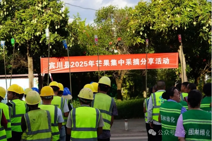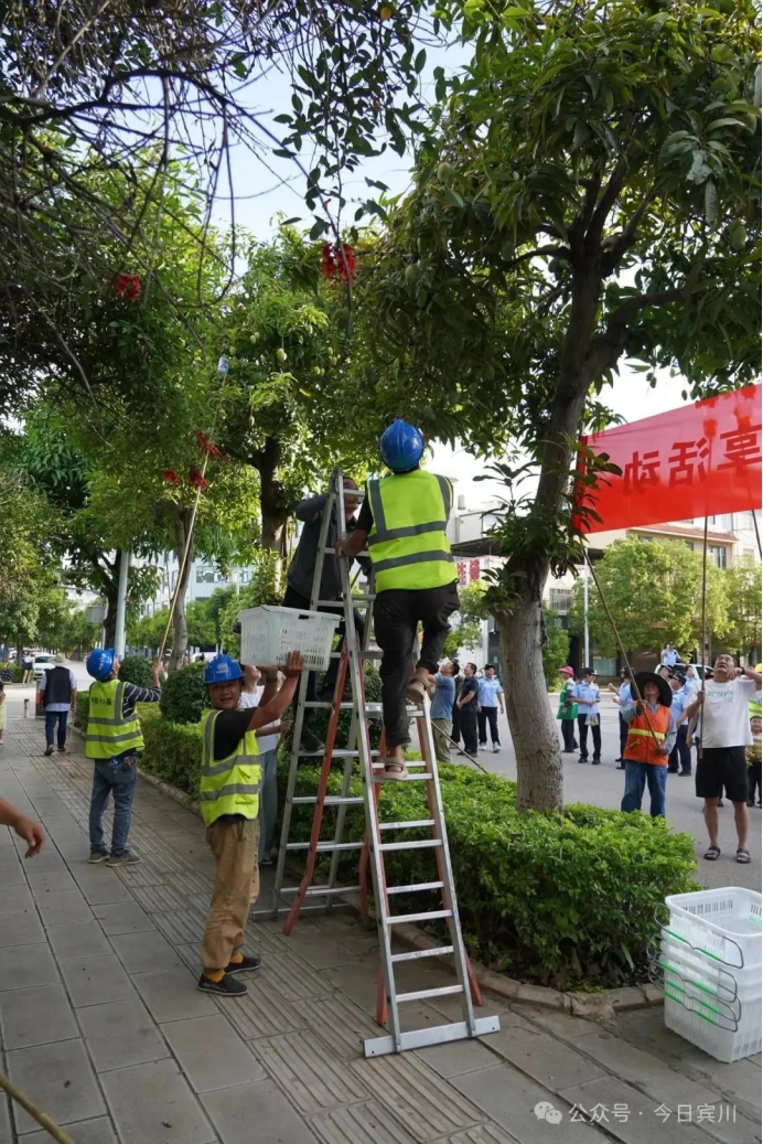 集中采摘现场,各族干部群众围在一棵棵芒果树下手持长杆,动作娴熟地采摘下行道树上的芒果,有的脚踩梯子直接用手采摘下成熟的芒果放入框中。宾川县城开启了全民共享行道树成熟芒果的丰收盛宴,一颗颗圆润饱满的芒果被市民们采摘品尝。