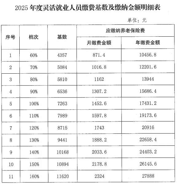 2025年,共设置25个缴费档次供参保人员自主选择,详见下表。